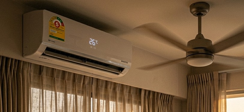 The Thai government officially recommends setting air conditioning to 26°C rather than 20°C, combined with a ceiling or standing fan. The thermodynamic logic is simple: each extra degree of cooling increases consumption by about 6 to 8%. Moving from 20°C to 26°C can reduce AC consumption by 30 to 40% — while staying comfortable if a fan circulates the air.
