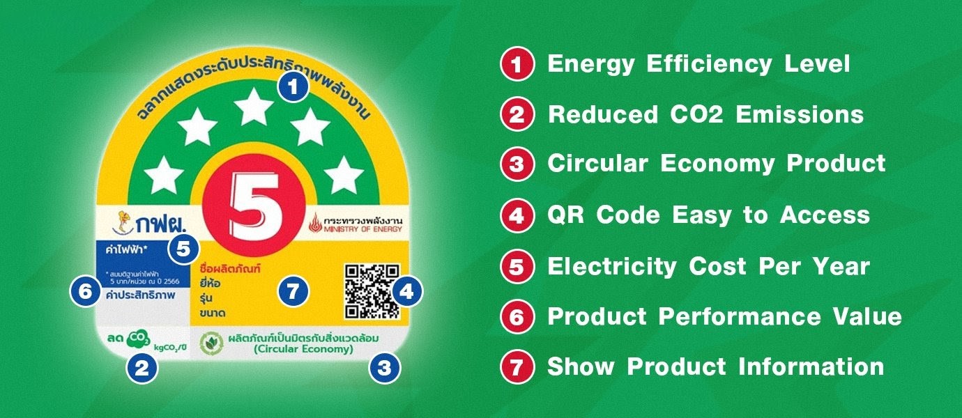 Air conditioners sold in Thailand carry a yellow energy efficiency label, rated from 1 to 5. The higher the number, the more efficient the unit. A “No. 5” (5-star) appliance can consume up to 30-40% less electricity than a basic model at equivalent cooling power.
